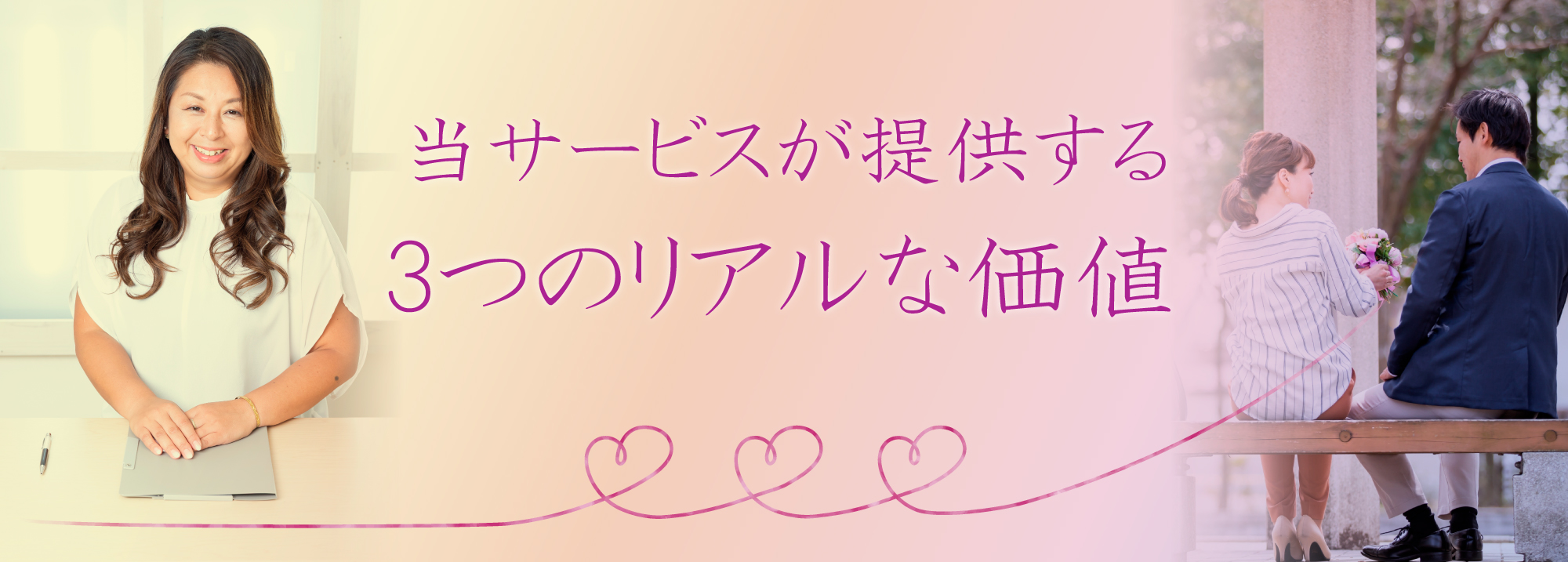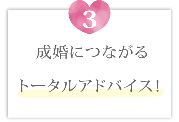 こうした課題に気づいた私は、「もっと親身で、もっと確実な婚活支援ができないか?」と考えるようになりました。当相談所ではこれらの課題を一つひとつ解決できるような体制を整えています。 大手にはできない細やかな対応で、あなたの婚活をトータルプロデュースいたします。